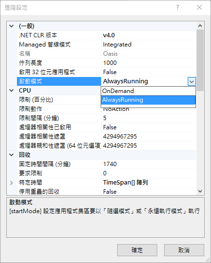 啟動模式設 AlwaysRunning (註: 記得確認已安裝「應用程式初始化」)![]()