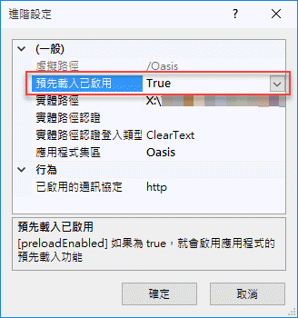 - 在 IIS 管理員站台或應用程式的進階設定啟用「預先載入已啟用」(Preload Enabled)      ![]()